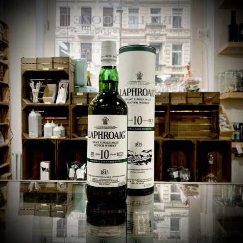 Eine 0,7 Liter Flasche Islay Whisky aus der Brennerei Laphroaig. Dieser Scotch Whisky ist ieine limitierte Version vom Laphroaig 10Jahre. Durch den hohen Alkoholgehalt ist der Abgang Langanhalten, kräftig, ledrig, speckig wie ein langer Abend am Lagerfeuer.