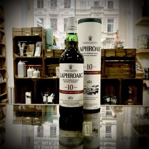 Eine 0,7 Liter Flasche Islay Whisky aus der Brennerei Laphroaig. Dieser Scotch Whisky ist im Ex Olorosso Sherry Fass gelagert, wodurch er im Abgang Kombination von nussige Noten, mit Manuka Honig und Ahornsirup. Gepaart mit einem rauchigen Aroma und einem angenehmen Lagerfeuerduft.